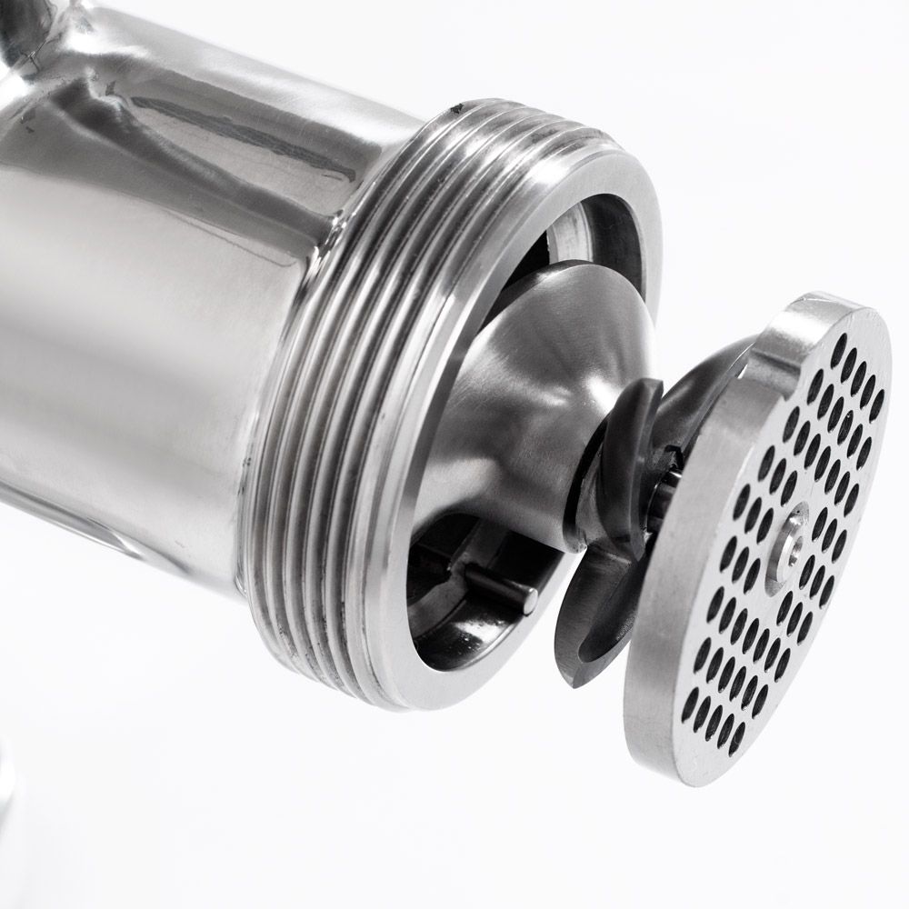 Für die Herstellung von Hackfleisch oder sogar die Verarbeitung von Fisch besonders geeignetes, kompaktes Gerät mit einem robusten Gehäuse aus Edelstahl und Aluminium.