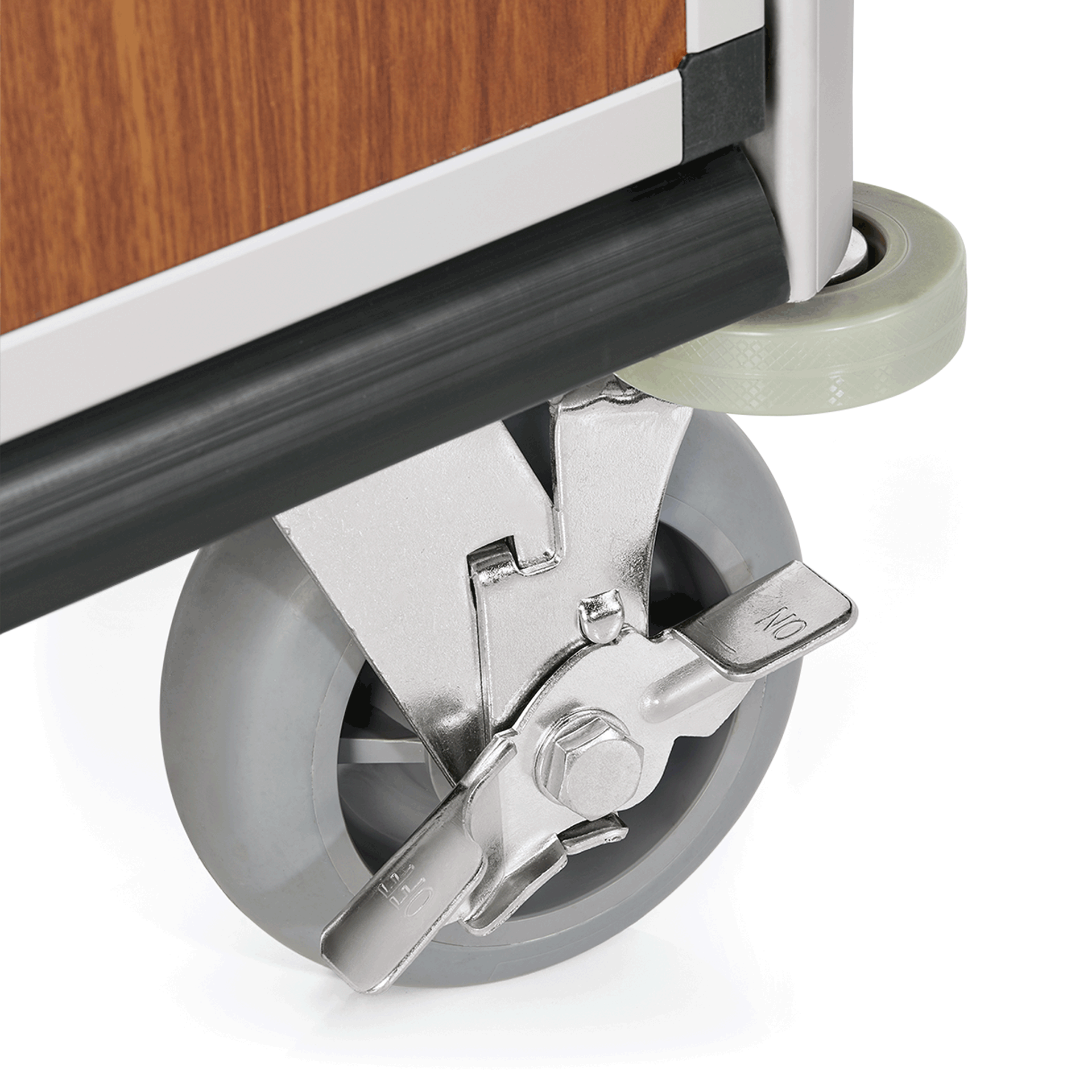 - 4 schwenkbare Rollen Ø 15 cm, davon 2 mit Feststeller