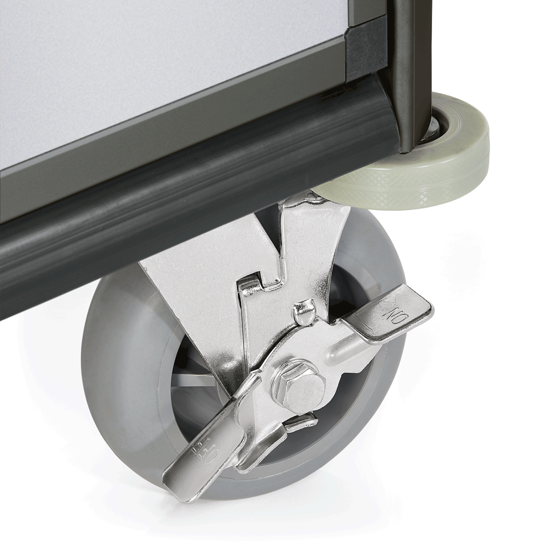 - 4 schwenkbare Rollen Ø 15 cm, davon 2 mit Feststeller