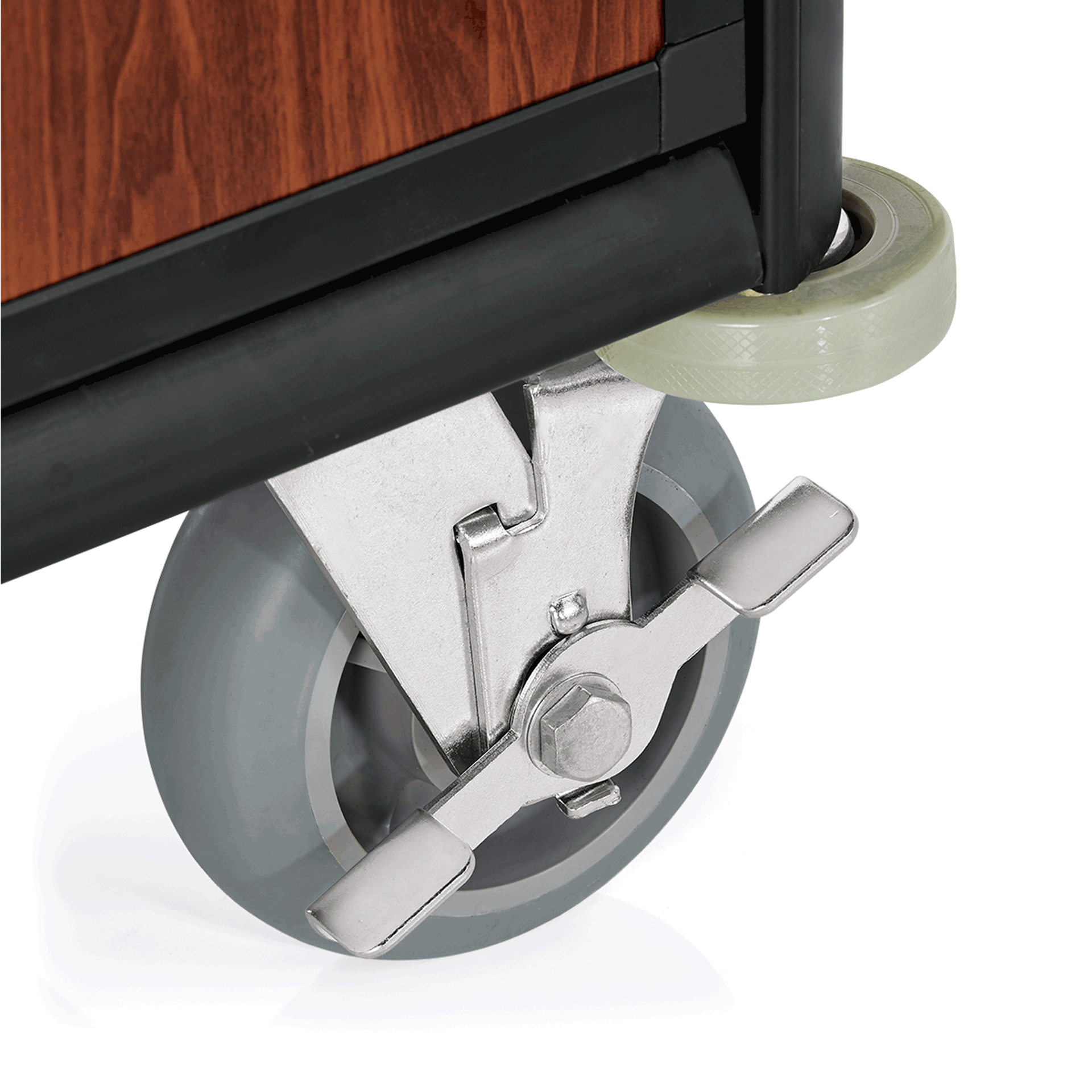 - 4 schwenkbare Rollen Ø 15 cm, davon 2 mit Feststeller