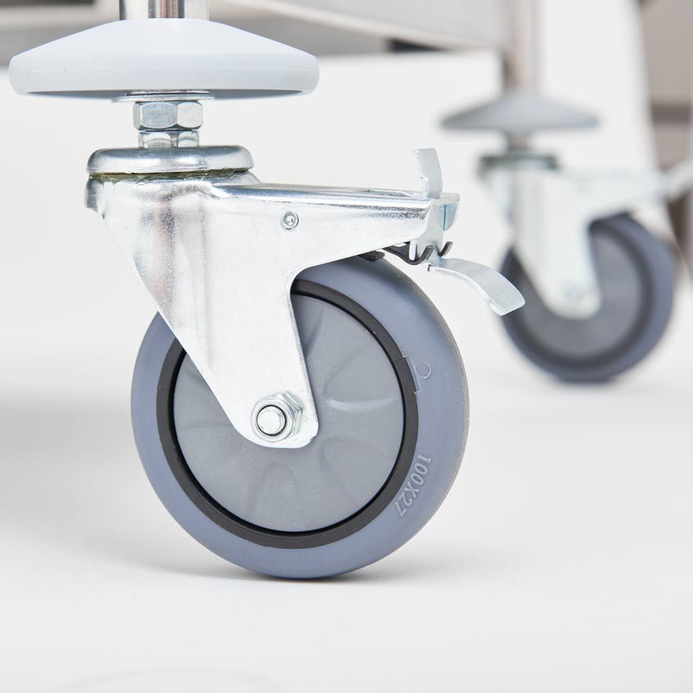 - Vier leichtgängige Räder, zwei davon mit Feststellbremse
