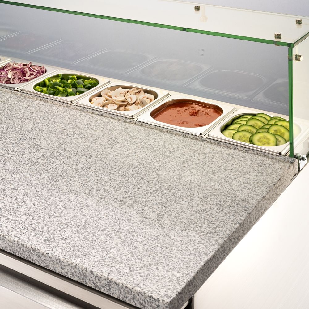 Optimaler Pizzatisch für die Grundausstattung Ihres gastronomischen Betriebes. Die Arbeitsfläche aus unverwüstlichem Granit ist kratz- und schnittfest sowie geschmacksneutral.