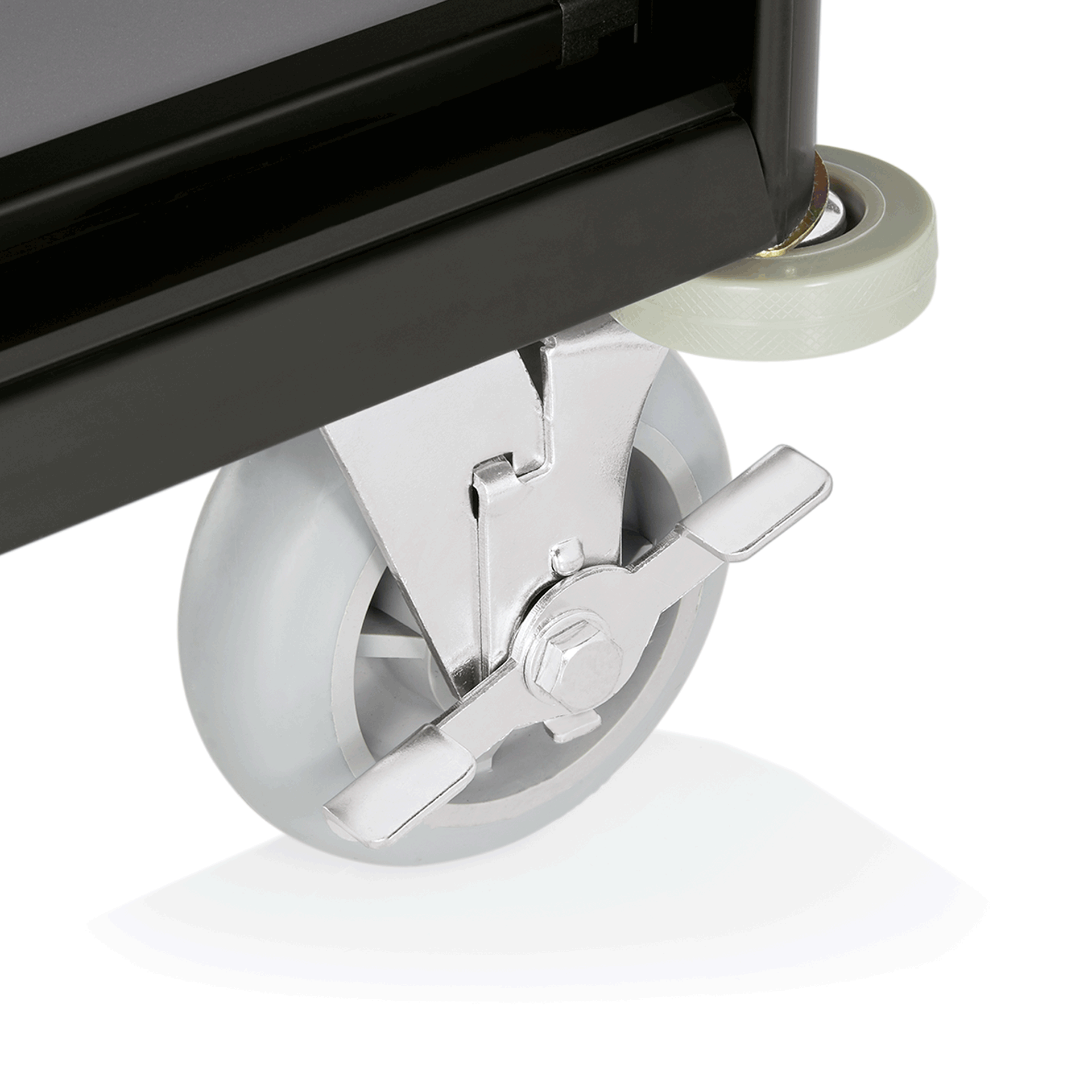 2 schwenkbare Rollen Ø 15 cm, mit Feststeller und 2 Bockrollen.
