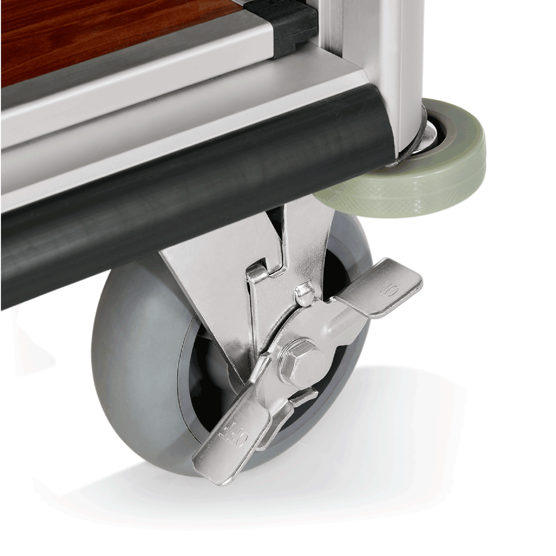 2 schwenkbare Rollen Ø 15 cm, mit Feststeller und 2 Bockrollen.