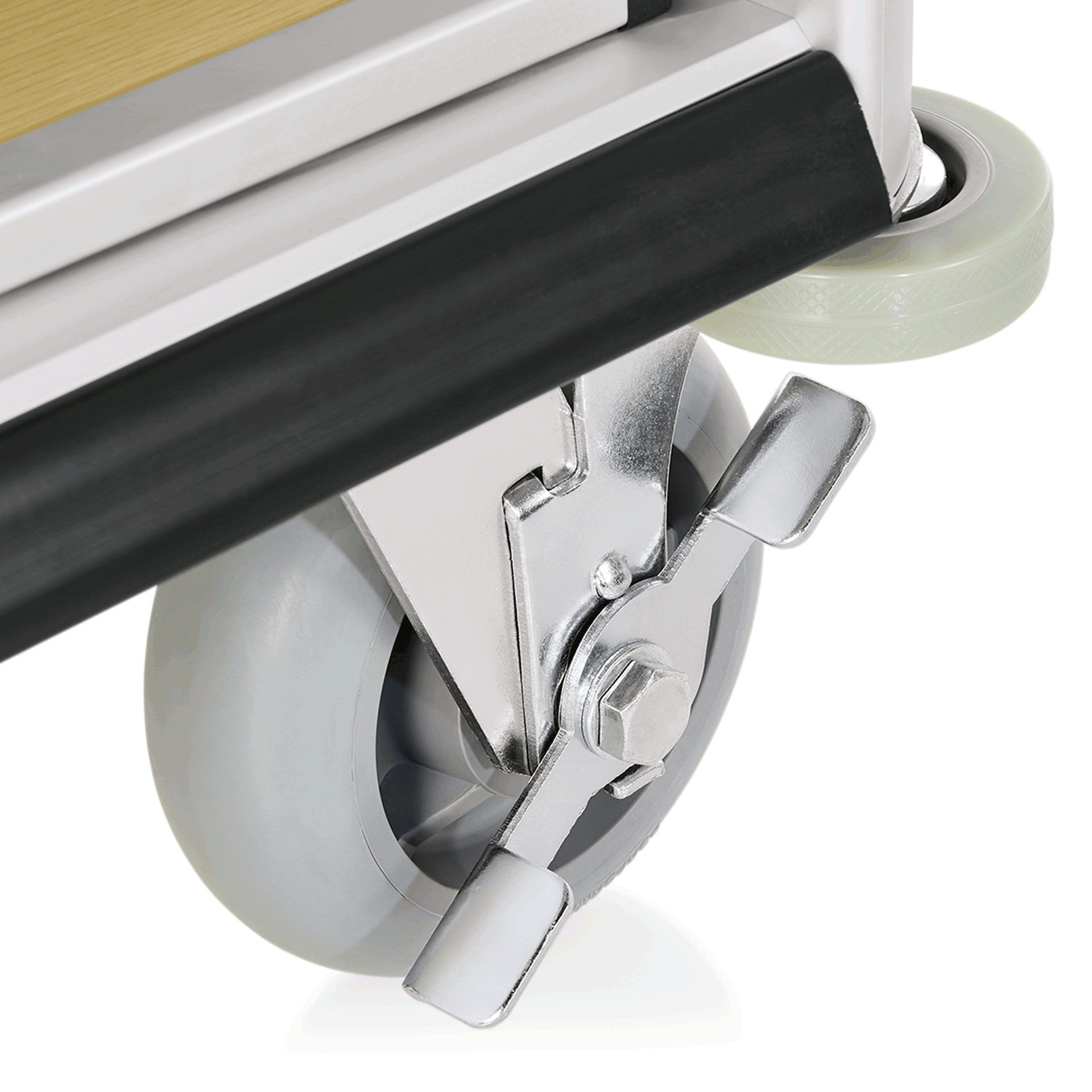 2 schwenkbare Rollen Ø 15 cm, mit Feststeller und 2 Bockrollen.
