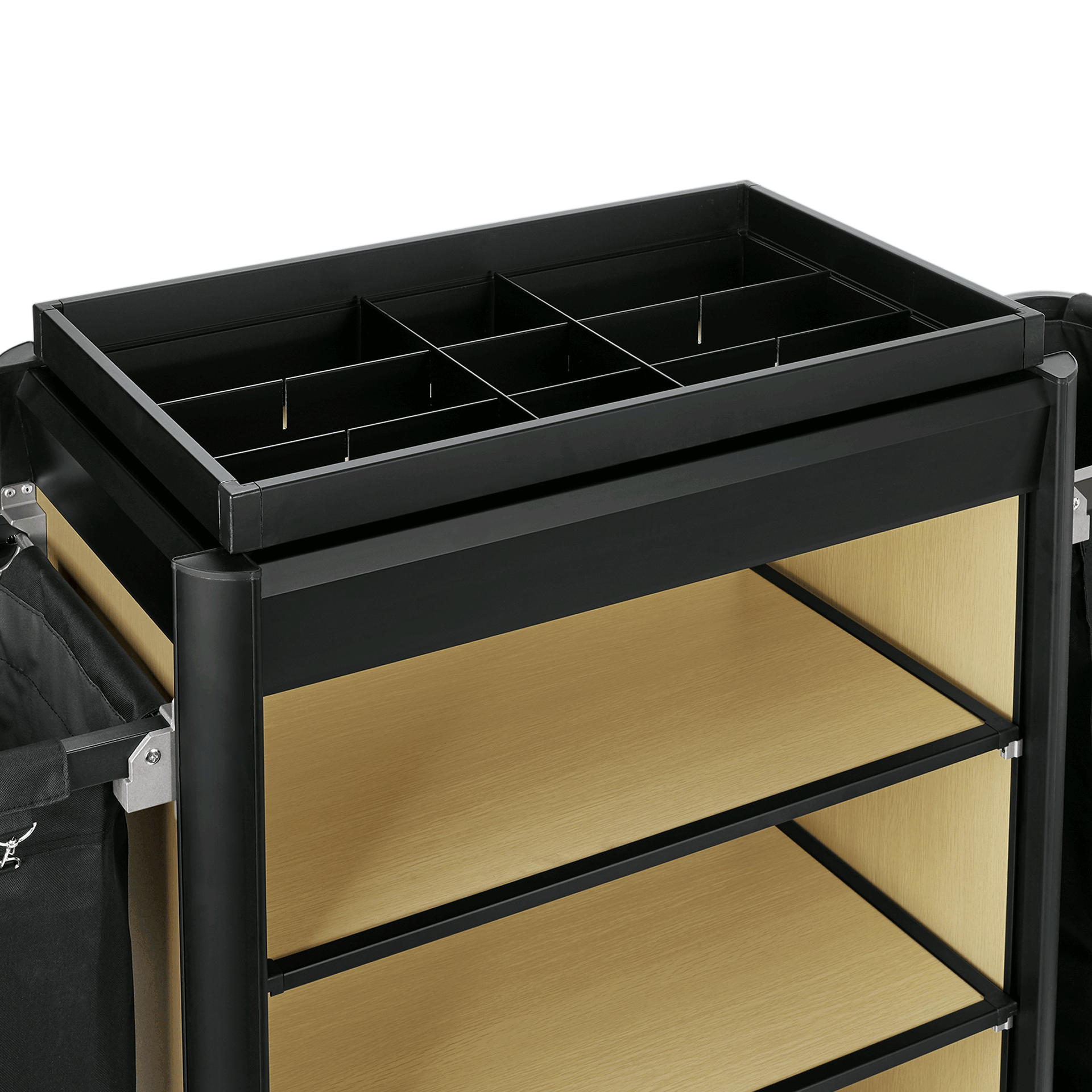 Aufsatzrahmen aus Aluminium mit variablen Einteilungen für Gästeartikel.