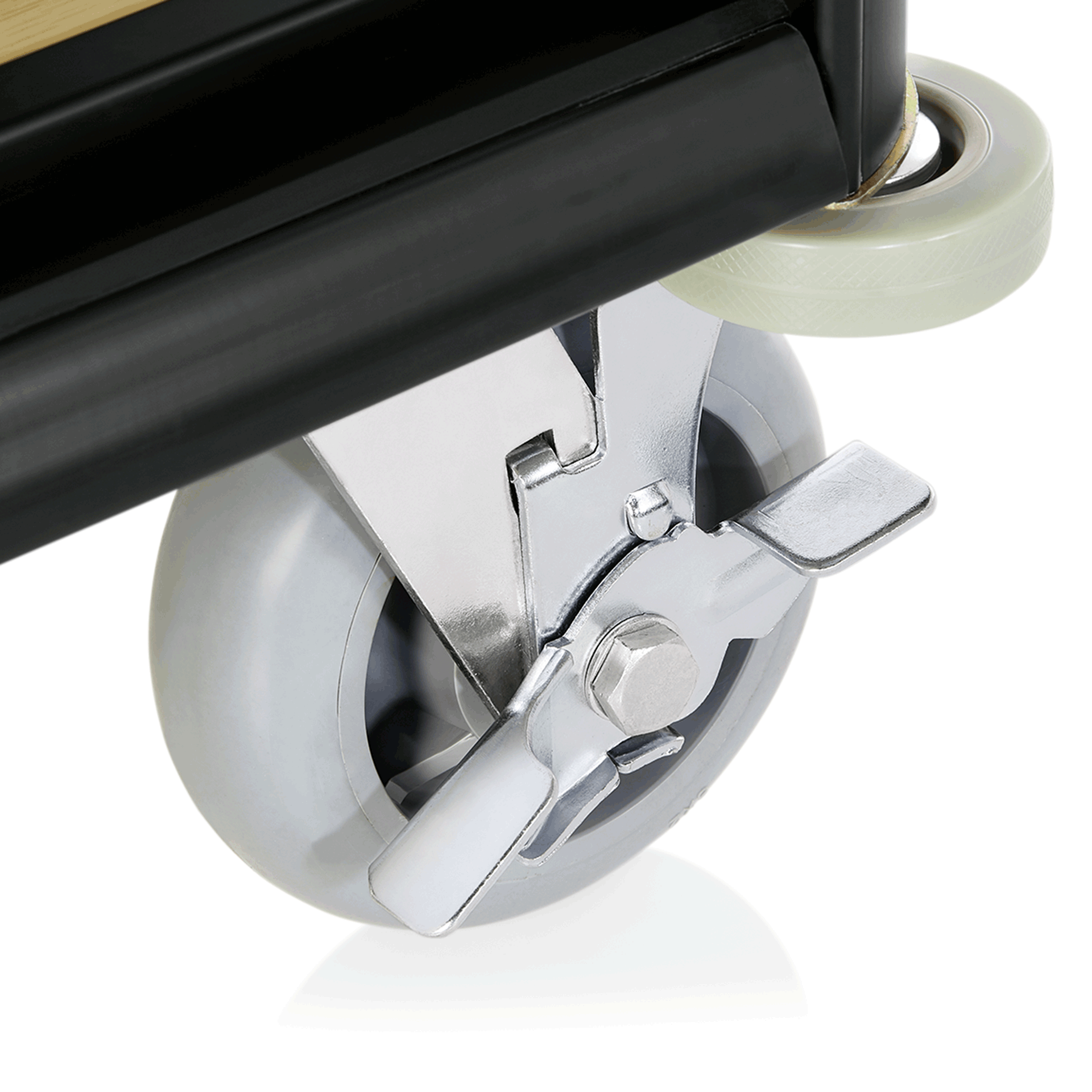 2 schwenkbare Rollen Ø 15 cm, mit Feststeller und 2 Bockrollen.