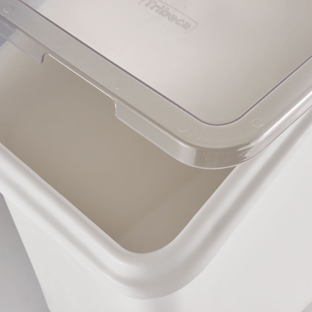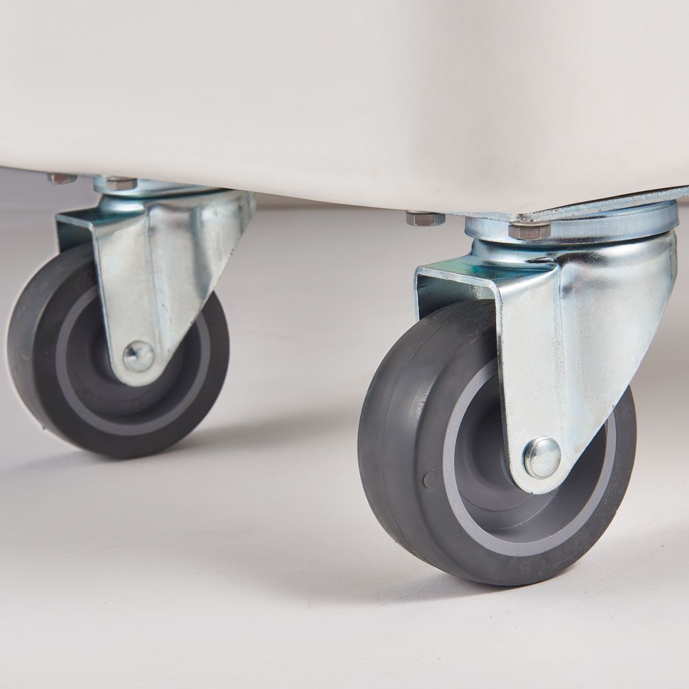 In diesen Vorratsbehälter passen z.B. 56 kg Mehl oder 73 kg Zucker. Ganz schön viel Gewicht! Deshalb steht der Behälter auf vier stabilen Rollen, damit Sie ihn leicht transportieren oder bei der Bodenreinigung verschieben zu können.